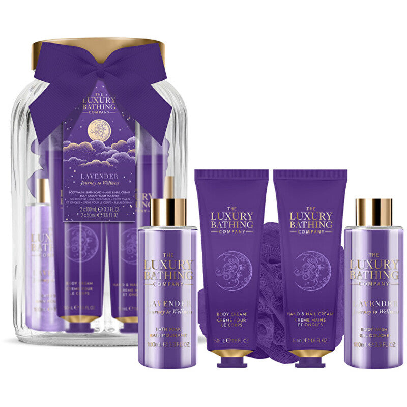 „Luxury Bathing Company“ kūno priežiūros dovanų rinkinys stikliniame indelyje (levandų)